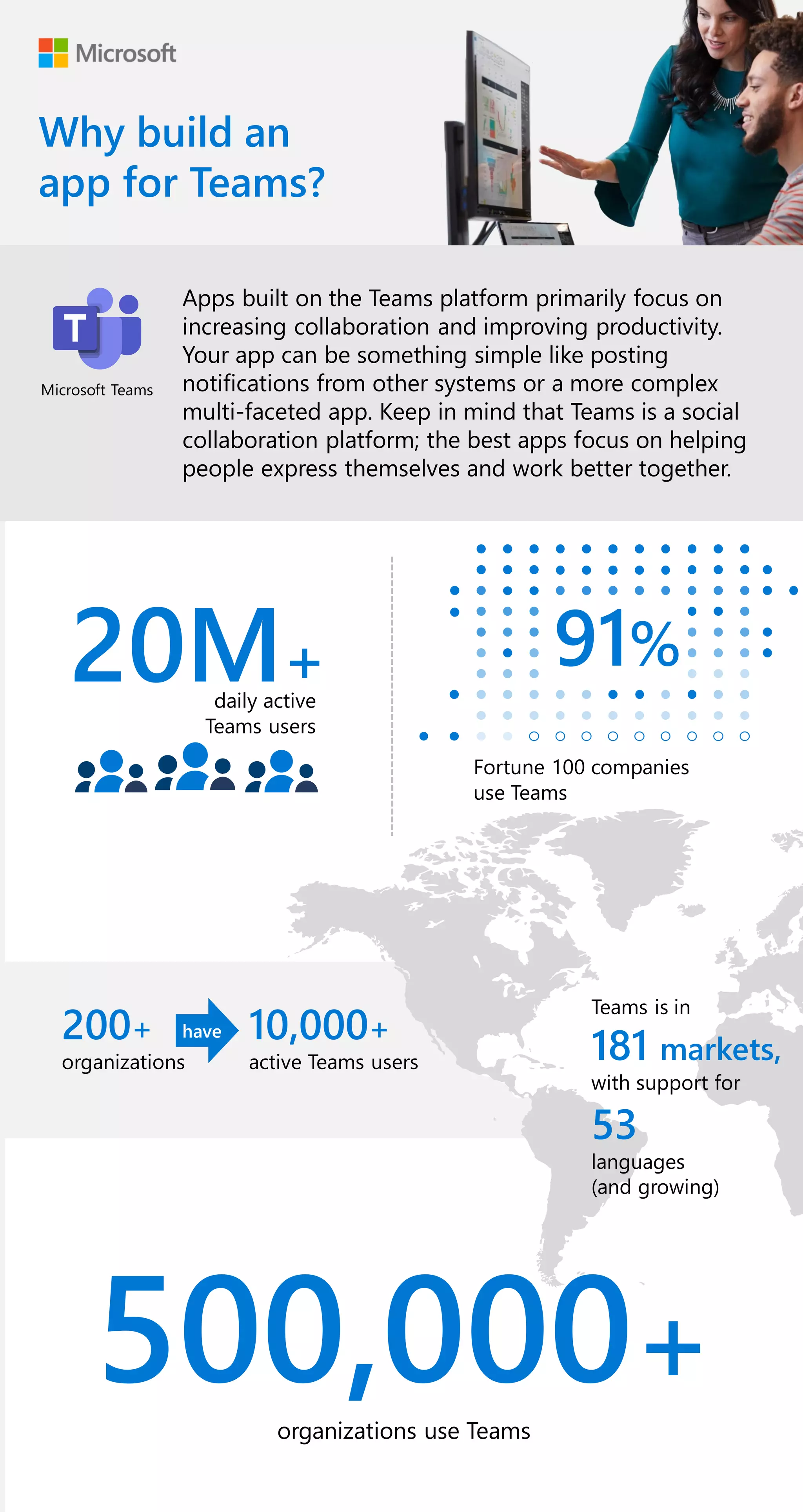 Over 20 million daily active users from Fortune 100 companies utilize Microsoft Teams, a platform designed to enhance collaboration and productivity. Apps developed for Teams range from simple notification systems to complex applications, emphasizing user expression and teamwork. Currently, Teams operates in 181 markets and supports over 500,000 organizations in 53 languages.