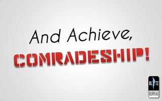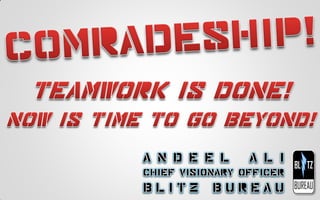 The document emphasizes the importance of comradeship in leadership, suggesting that true leadership cannot exist without teamwork and mutual support. It lists various roles and indicates participation levels among team members, reflecting collaboration dynamics. Overall, the message highlights that successful leadership relies on collective effort.