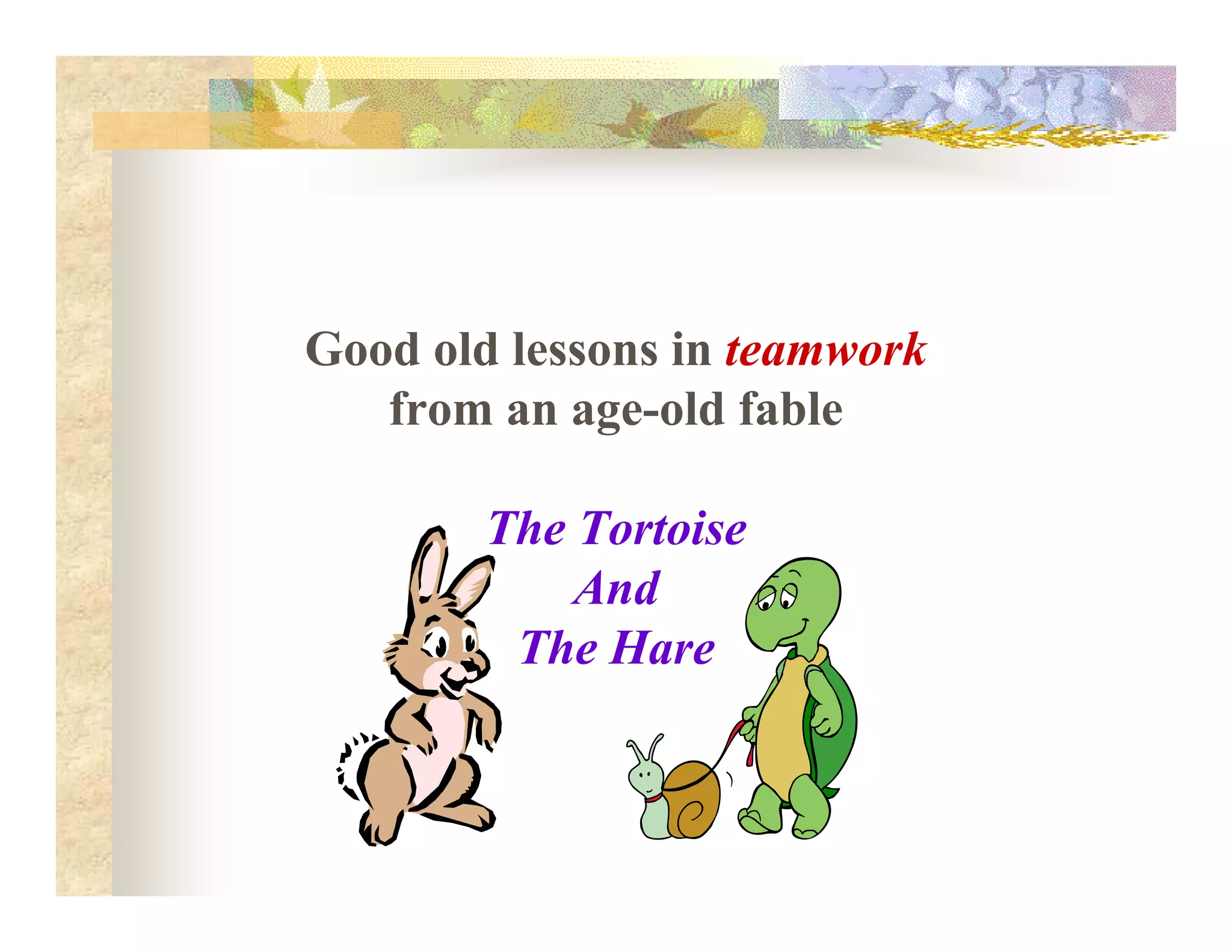 This document retells and expands on the classic fable of the Tortoise and the Hare. It describes how the hare initially wins the race by overconfidence but then loses to the tortoise. The story is then expanded with multiple rematches where both learn lessons. They learn that being fast and reliable beats slow and steady, working to one's strengths is important, and teamwork allows one to overcome weaknesses by pooling competencies. The moral is that persistence, adapting strategy, not giving up, competing against problems rather than rivals, and cooperation can lead to success.