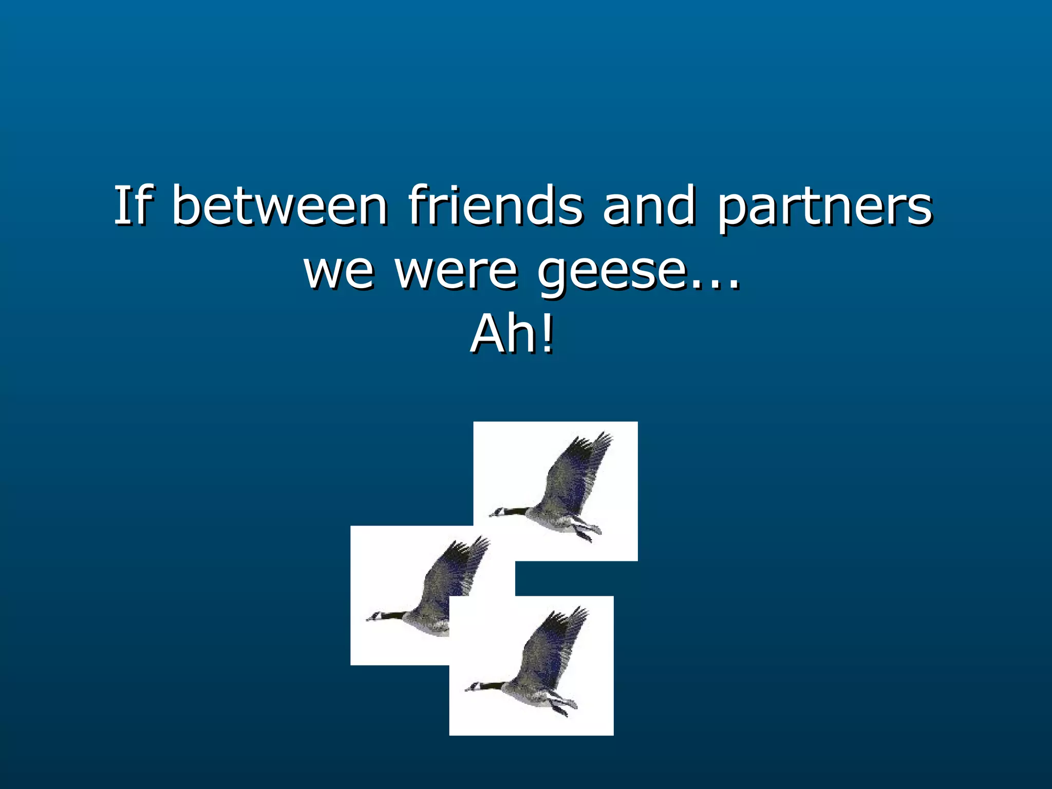 The document discusses lessons that can be learned from the flying formation of geese. It notes that geese fly in a V-shape formation which allows them to fly 71% farther than if they flew alone. It provides five lessons: 1) Working as a team gets you to your destination quicker, 2) Staying united with others going in the same direction makes the effort easier, 3) Sharing leadership responsibilities, 4) Encouragement from others provides motivation, and 5) Supporting each other especially during difficulties. The overall message is that by working together as a team like geese, life will be easier and more fulfilling.