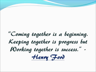 Trust, accountability, and efficiency are key secrets to successful teamwork. Teamwork requires building trust among members by overcoming the need for invulnerability. It is important that members are accountable for their roles. Working individually takes a long time, provides no help from others, lacks motivation from a team, has limited skills, and causes too much stress. In comparison, teamwork can leverage diverse skills and ideas from members, provide support, and help motivate individuals to achieve more in less time.