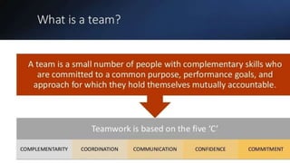 Teamwork is the collaborative effort of a group to achieve a common goal or to complete a task in the most effective and efficient way. This concept is seen within the greater framework of a team, which is a group of interdependent individuals who work together towards a common goal.