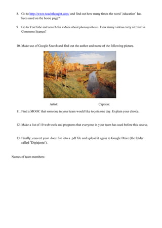This document provides instructions for a team webquest involving 13 tasks to be completed in 60 minutes. The tasks include translating a phrase to Estonian, deciphering net lingo, writing a team poem in Estonian, interviewing other teams, using a QR code, taking photos with captions, searching websites, identifying an image's author, finding a MOOC, and listing web tools. The team is to complete the tasks in a Microsoft Word file and convert it to a PDF to upload to Google Drive.