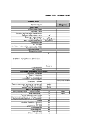 Документ описывает технические характеристики Nissan Teana 2.5 л в различных комплектациях, включая информацию о двигателе, трансмиссии, размерах и динамических показателях. Указаны параметры двигателя QR25DE, такие как мощность, крутящий момент, рабочий объем и тип топлива, а также данные о подвеске, тормозной системе и расходе топлива. Также представлены сведения о размерах автомобиля, максимально разрешенной нагрузке и аэродинамических характеристиках.