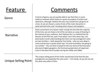 The teaser trailer is for the film "Legend" about the Kray twins, English gangsters in 1950s-60s London. It establishes the crime and action genre through scenes of violence and weapons. The narrative introduces the twin protagonists played by Tom Hardy, who say they will "run London". Unique is having one actor play twins. The target audience is males aged 16-25 but also older people interested in the 1960s era. Old-fashioned music sets the time period. Shots include close-ups of characters' faces and suits to show their appearance and wealth. The pace and action increase throughout, building excitement. The only dialogue is one twin saying they will rule London. There is no voiceover