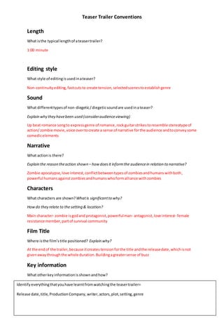 The typical teaser trailer is about 1 minute long and uses non-continuous editing with fast cuts to build tension by showing selected scenes that establish the genre. The sound used includes upbeat music to indicate romance, rock guitar to suggest action/horror, and voiceovers to provide narrative elements and convey comedy. Scenes shown involve a zombie apocalypse, a love interest, and conflict between zombies and humans who form alliances, with the goal of informing audiences about the narrative without revealing too many details. Main characters are introduced who relate to the survival community setting. The film title is purposely shown at the end to build tension and buzz without revealing the release date. Key information given includes the release date, title,