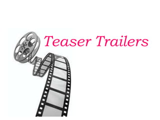 Teaser trailers are short advertisements, 30-60 seconds long, released months before a film to build anticipation without revealing much about the film's content. They aim to pique audience interest through cryptic references or hints at the story. Teaser trailers are a low-cost marketing technique used for big-budget or highly anticipated films to generate early buzz and interest leading up to the film's release.