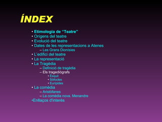 Etimologia de “Teatre”Orígens del teatre Evolució del teatre Dates de les representacions a Atenes Les Grans Dionísies L’edifici del teatre La representació La Tragèdia Definició de tragèdia Els tragediògrafs Èsquil Sòfocles Eurípides La comèdia Aristòfanes La comèdia nova. Menandre Enllaços d'interès ÍNDEX