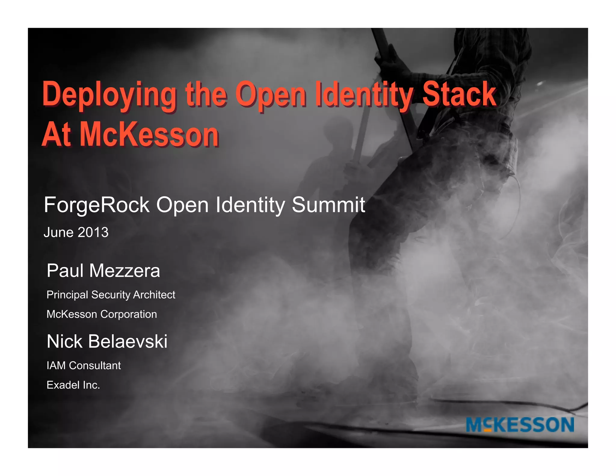 The document outlines a presentation at the Forgerock Open Identity Summit, detailing a partnership between McKesson Corporation and Exadel Inc. to deploy the Open Identity Stack. Key topics include the implementation of single sign-on solutions via Active Directory, user identity management use cases, and the architecture of the identity management user interface. The presentation emphasizes collaboration in creating a sustainable future for healthcare and provides contact information for further inquiries.