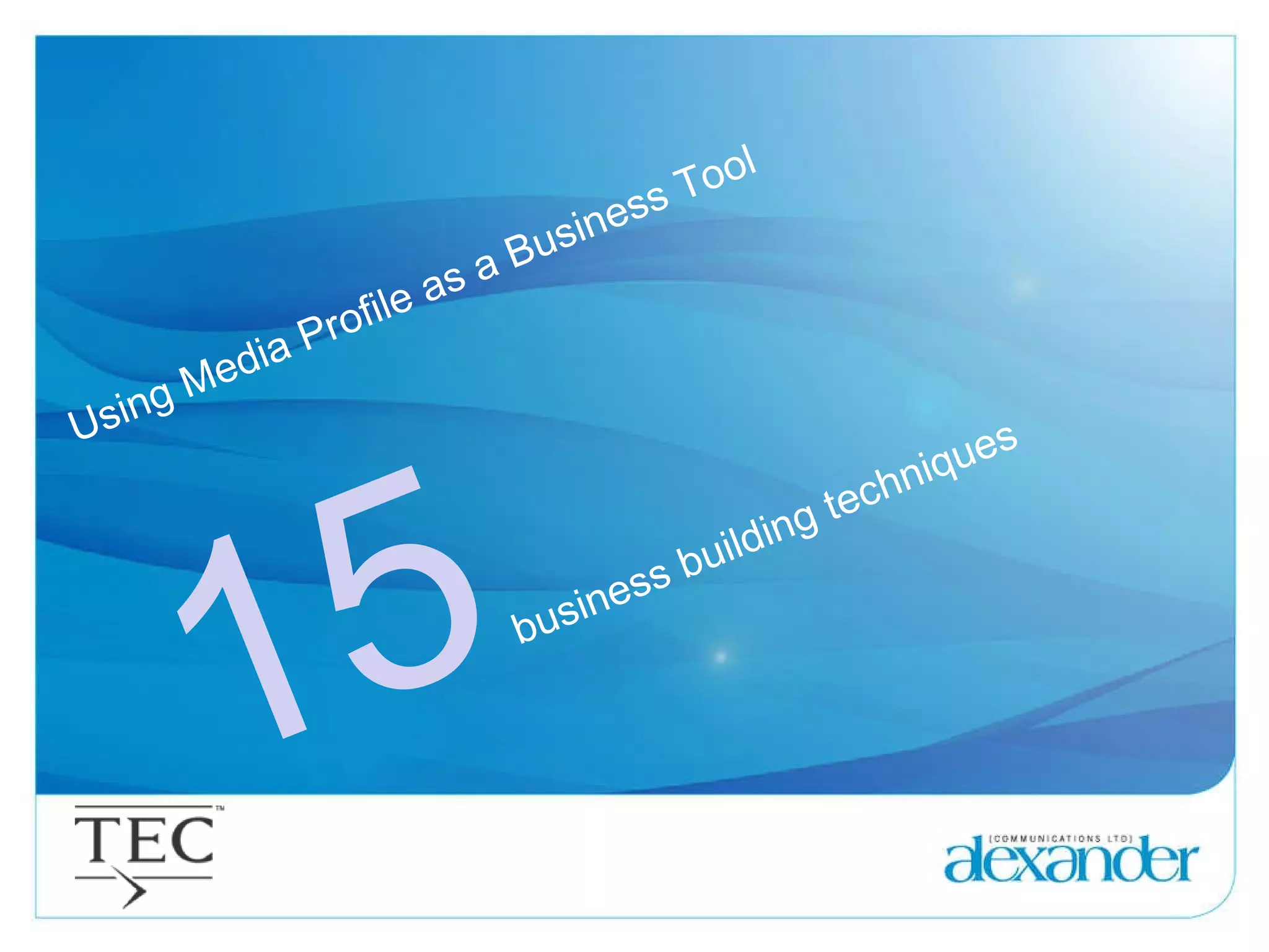 The document provides tips and techniques for using media profiles as a business tool. It discusses 15 techniques for building credibility and reputation through media engagement, including having an opinion, a good photo, an elevator pitch, and utilizing business milestones. The document then provides additional tips for more experienced businesses, such as developing a media section, using media endorsements, networking, writing a blog, telling stories, and engaging with bloggers. The presenter emphasizes starting small with initiatives and building media mentions and endorsements over time to grow a business using media profiles.