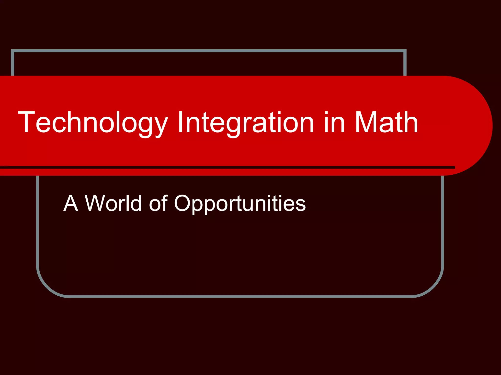 The document discusses the benefits of integrating technology into math instruction. It argues that technology allows students to make and test conjectures and work at higher levels of abstraction. It notes that technology skills will be important for students' future careers. The document provides examples of how different technologies like podcasts, GPS, art software, and online collaboration can be used to enhance math learning and engage students. It emphasizes that technology should not replace the teacher but rather be used to enhance students' mathematical thinking.