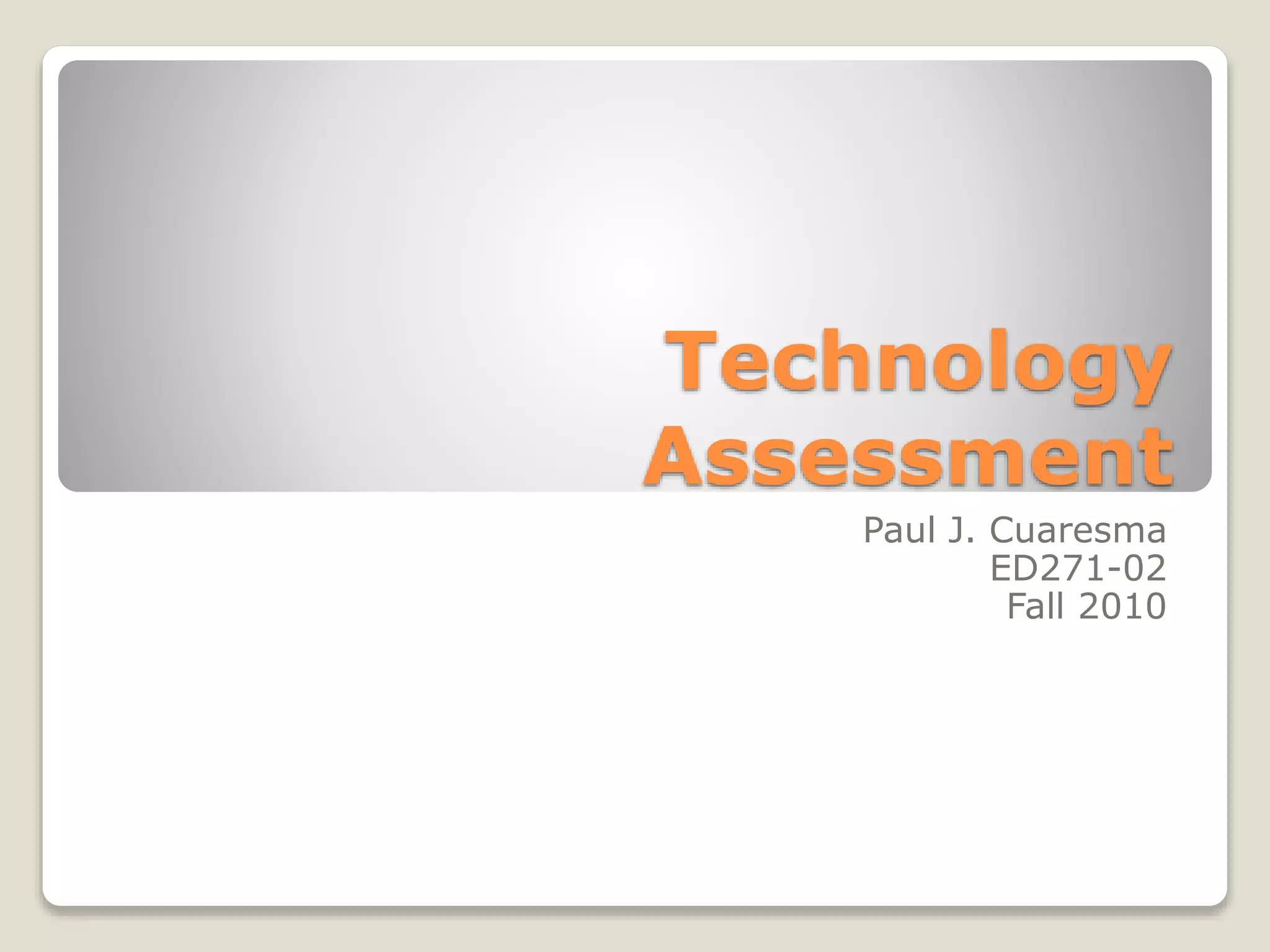 This document provides ratings and reviews of 8 technologies: Moodle, Firefox, Google Apps, SlideShare.net, Prezi.com, Diigo.com, VoiceThread.com, and Camino. Moodle, Firefox, Google Apps, SlideShare.net, and Diigo.com receive ratings of 4 or 5 out of 5 for their useful features and educational applications. Prezi.com receives a 3 due to its steep learning curve. VoiceThread.com receives a 4 but has limitations for free accounts. Camino receives a 3 as it has no outstanding features compared to other browsers. In conclusion, many of these technologies could enhance the author's classroom while others may be less useful.