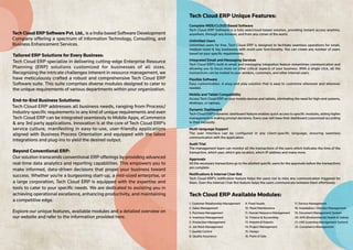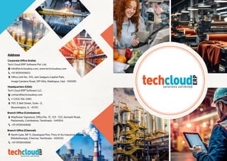 Tech Cloud ERP Software Pvt. Ltd. is an India-based company offering a comprehensive cloud-based ERP solution designed for businesses of all sizes, featuring modules for various management functions such as finance, HR, and production. The software promotes unlimited user access, customizable dashboards, and integrated communication tools to facilitate efficient operations. Their offerings include real-time data analytics and seamless integration with mobile apps and third-party applications for tailored business solutions.