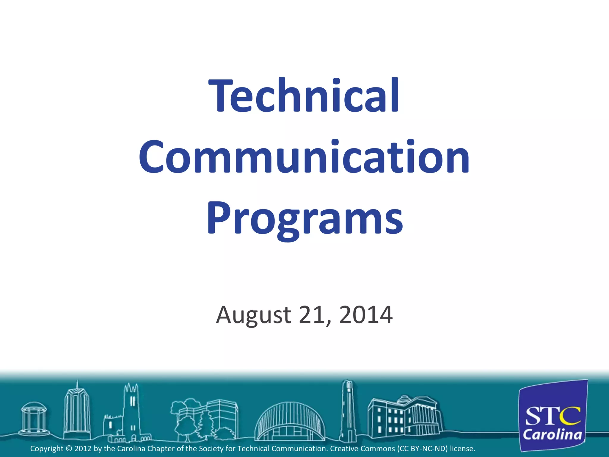 This document lists technical communication programs in North Carolina, including master's programs at North Carolina State University, Wake Tech, East Carolina University, UNC-Charlotte, and Mercer University. It also describes technical communication opportunities at Winthrop University and a certificate program at Duke University. Resources on technical communication careers and scholarships are provided.