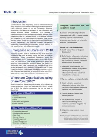This document discusses enterprise collaboration using Microsoft SharePoint 2010. It provides an overview of SharePoint 2010's capabilities for content management, records management, and business process management. It also highlights how leading organizations are using SharePoint 2010 for their intranet, portal, content, collaboration and knowledge management needs. Examples of successful implementations at companies like Sony Electronics, Owens Corning, and a fire safety products company are also mentioned.