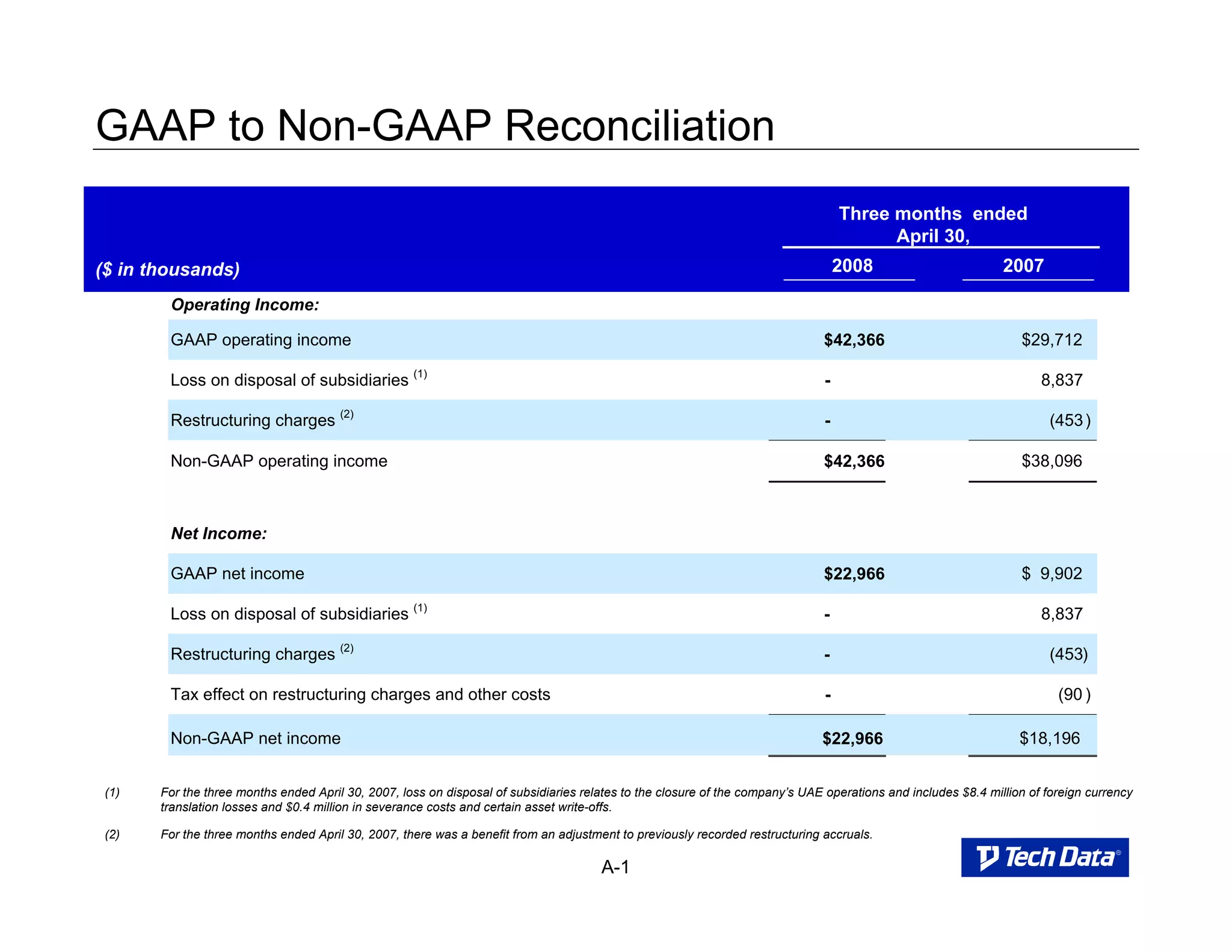 This document provides a reconciliation of GAAP operating income, net income, and net income per diluted share to non-GAAP amounts for the company for the three months ended April 30, 2008 and April 30, 2007. It shows that non-GAAP operating income and net income were higher than GAAP amounts for both periods due to the exclusion of losses from the disposal of subsidiaries and restructuring charges. Non-GAAP net income per diluted share was also higher after excluding these items and their related tax effects.