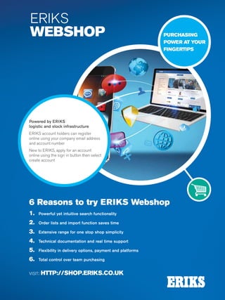 ERIKS is a supplier of industrial products and services that offers solutions across several areas including bearings, power transmission, fluid power, sealing, flow control, tools, safety, and maintenance. ERIKS has extensive product inventory and technical expertise provided by application engineers to help customers solve problems. In addition to products, ERIKS also provides services like condition monitoring, asset management, and on-site maintenance to support customers over the entire life cycle of products and help lower total cost of ownership. ERIKS aims to form partnerships with customers and help save their engineering time.