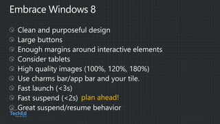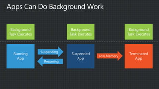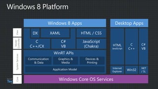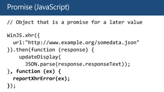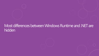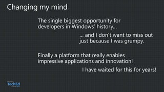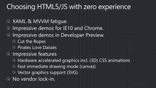 The document discusses the developer's frustration with Microsoft's lack of support for WPF and focus on newer technologies like Windows 8 apps and JavaScript. It notes Microsoft's history of creating fear, uncertainty and doubt around WPF. The developer then discusses their positive experience transitioning from C# to JavaScript for Windows 8 app development and how much they enjoy the HTML5 and JavaScript environment on Windows Runtime.