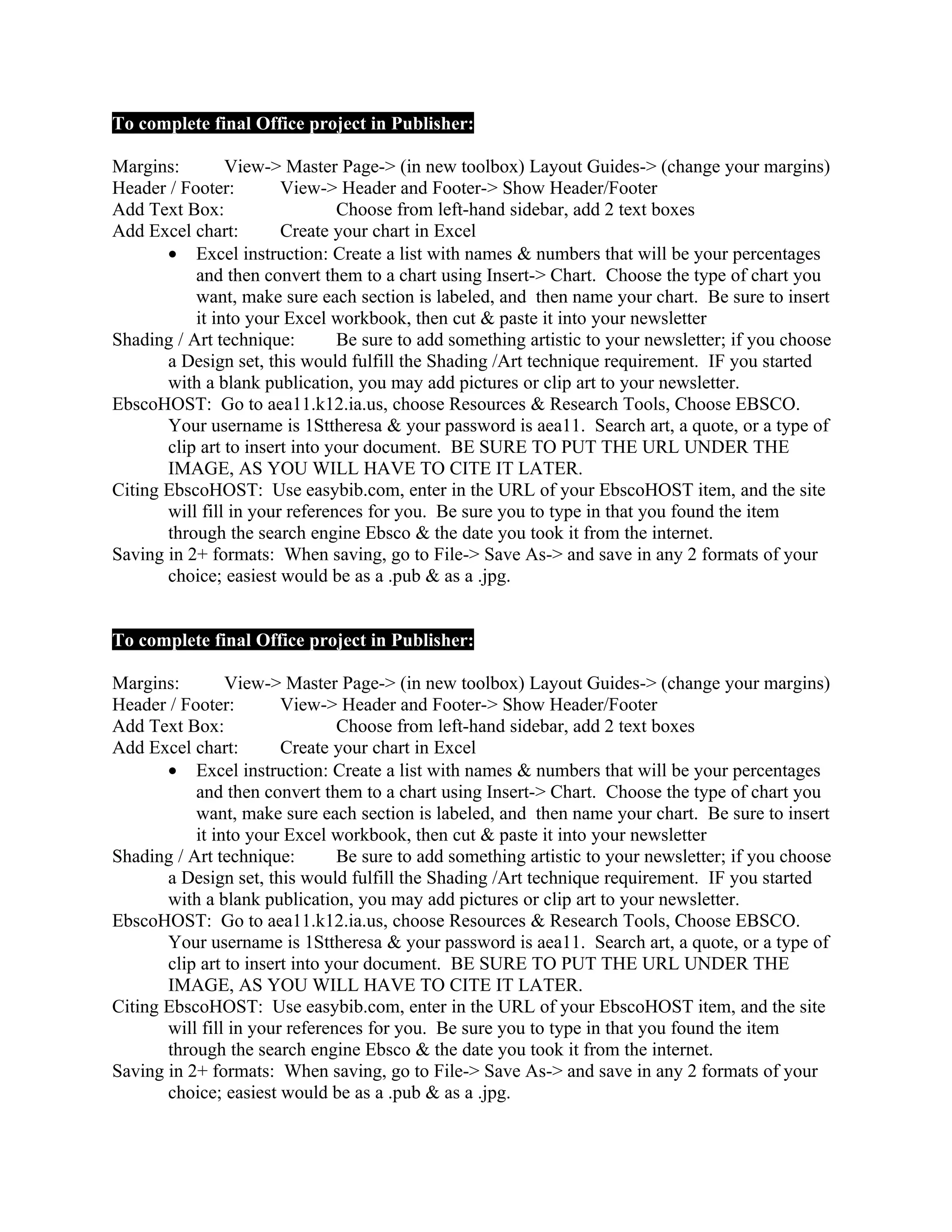The document provides instructions for completing a final Office project in Publisher, including how to change margins and add headers/footers, insert text boxes and an Excel chart, add artistic elements, search EbscoHOST for images or quotes and cite them properly, and save the file in multiple formats. Steps include using the Master Page toolbox to set layout guides, pasting a chart created in Excel, choosing a design set or adding pictures for shading/art, searching EbscoHOST using provided login credentials, using EasyBib to generate citations using the EbscoHOST URL, and saving in formats like .pub and .jpg.