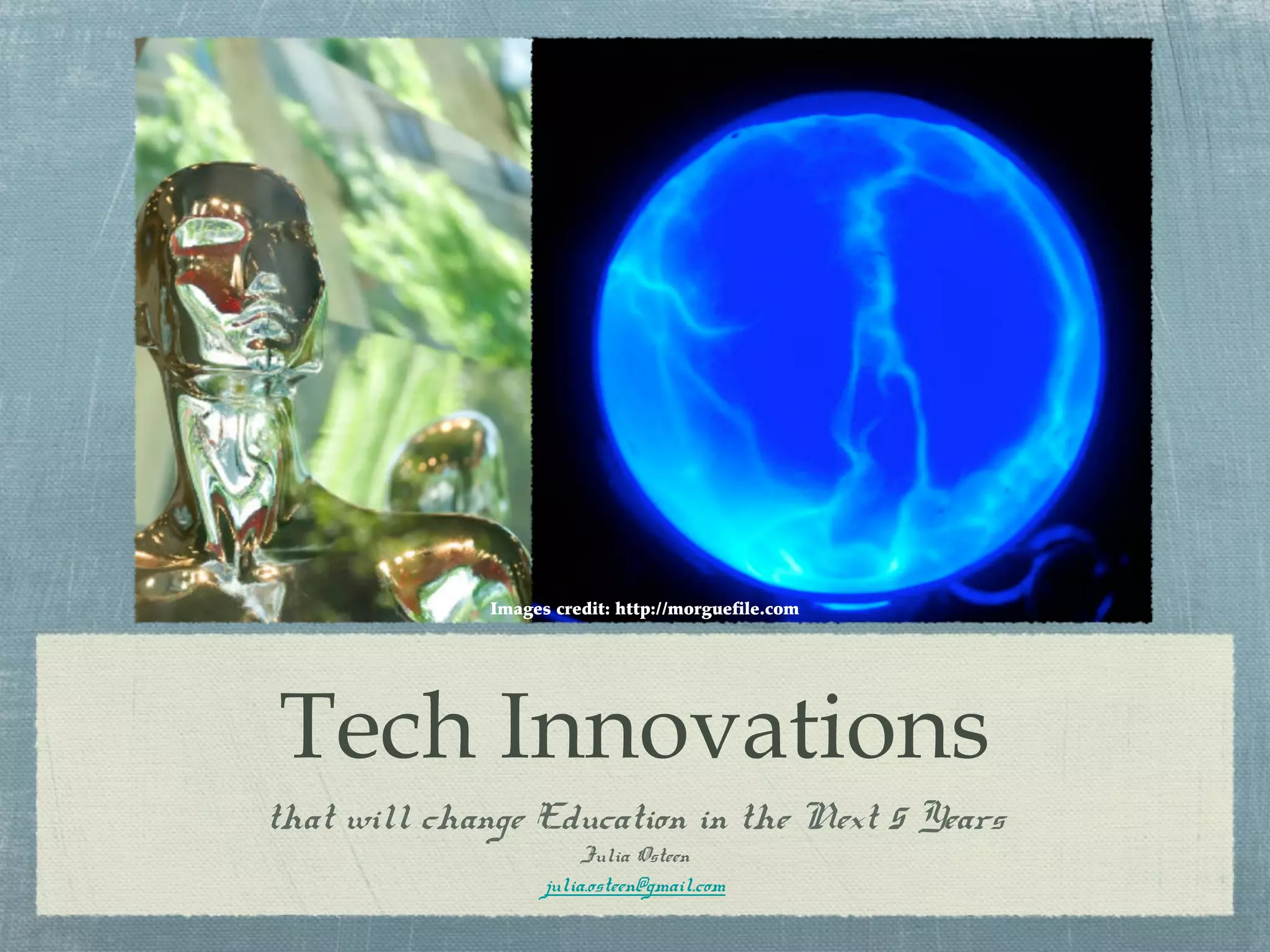 This document discusses several technology innovations that will change education in the next 5 years. It predicts that online learning through MOOCs will become more prominent, reaching more students and promoting transparency. Blended learning models that combine online and face-to-face learning will improve, using better learning management systems and metrics. Assessments will move away from one-size-fits-all testing to adaptive computer-based assessments and digital portfolios. Mobile devices will also significantly impact education through app-based learning and management of devices in classrooms.