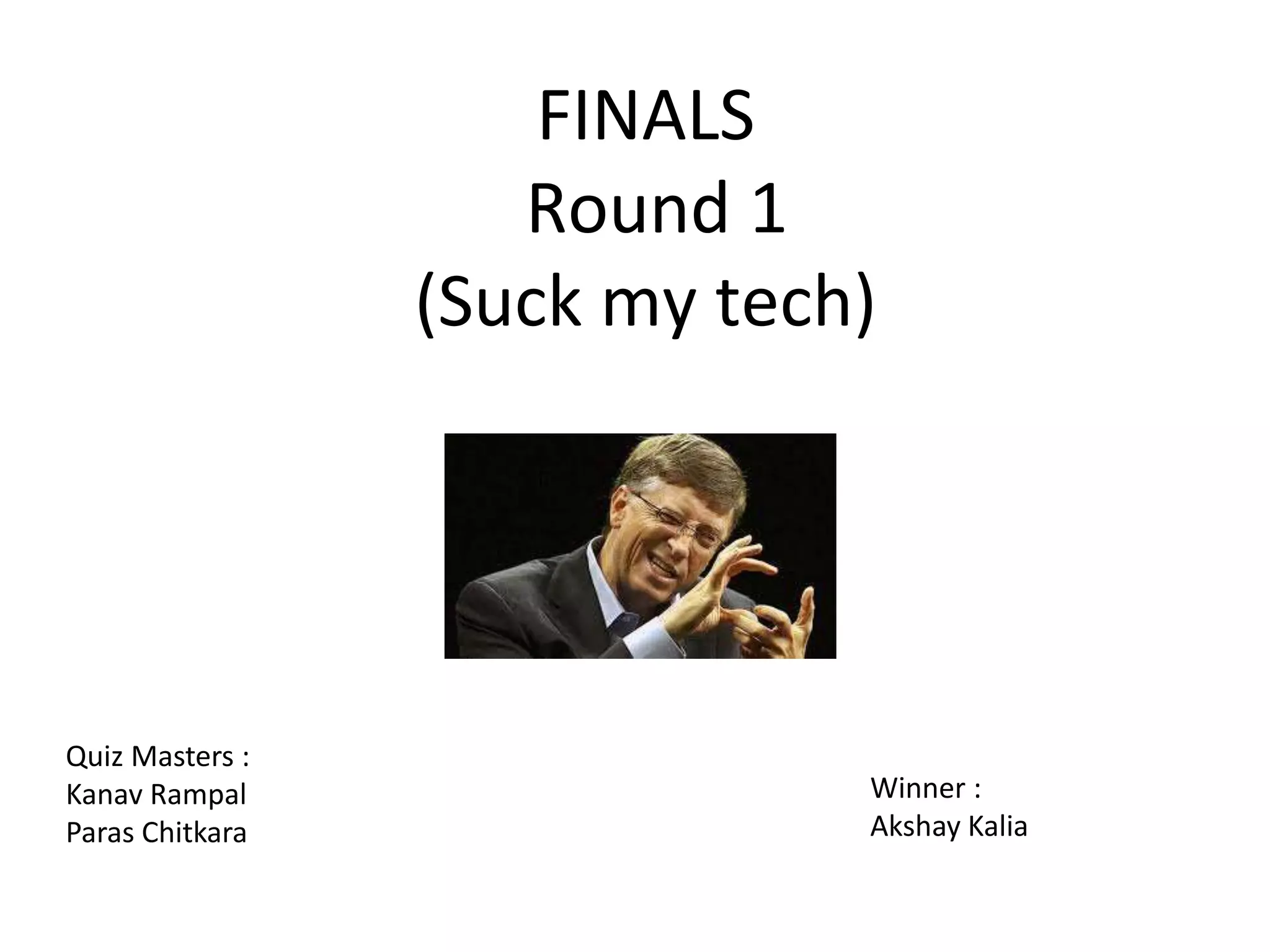 The document summarizes the results of a quiz competition between teams "Suck my tech" and an opponent named Akshay Kalia. It provides the names of the quiz masters, Kanav Rampal and Paras Chitkara, and indicates that Akshay Kalia was the winner. The document then lists the rules of the competition and includes several multiple choice questions on topics like gaming, gadgets, internet, startups, and personalities. It provides the correct answers to each question.
