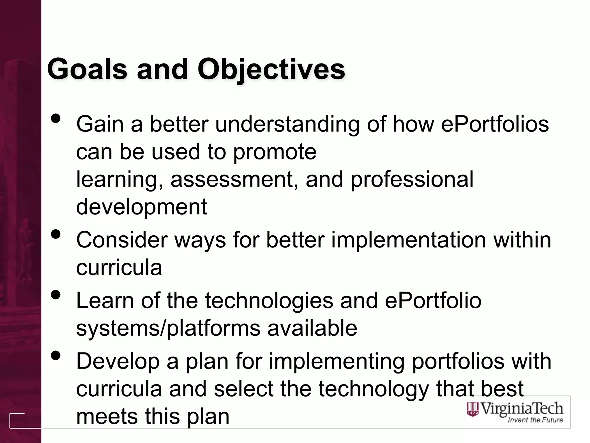 The goal is to help participants gain a better understanding of ePortfolios and develop an implementation plan tailored to their needs and curriculum.