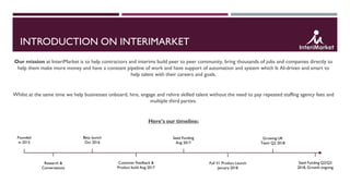 Platform Solution for Skilled Contractors provides an overview of InteriMarket's mission to help contractors build community and access work opportunities through an AI-driven platform. The platform connects skilled contractors with businesses needing short-term talent. It aims to hire, engage, and rehire contractors within hours instead of weeks. InteriMarket is currently hiring for several roles, and its platform lists contract and interim jobs in industries like IT, construction, and finance. For both talent and businesses, early results show increased speed of hiring and decreased costs compared to traditional staffing agencies.