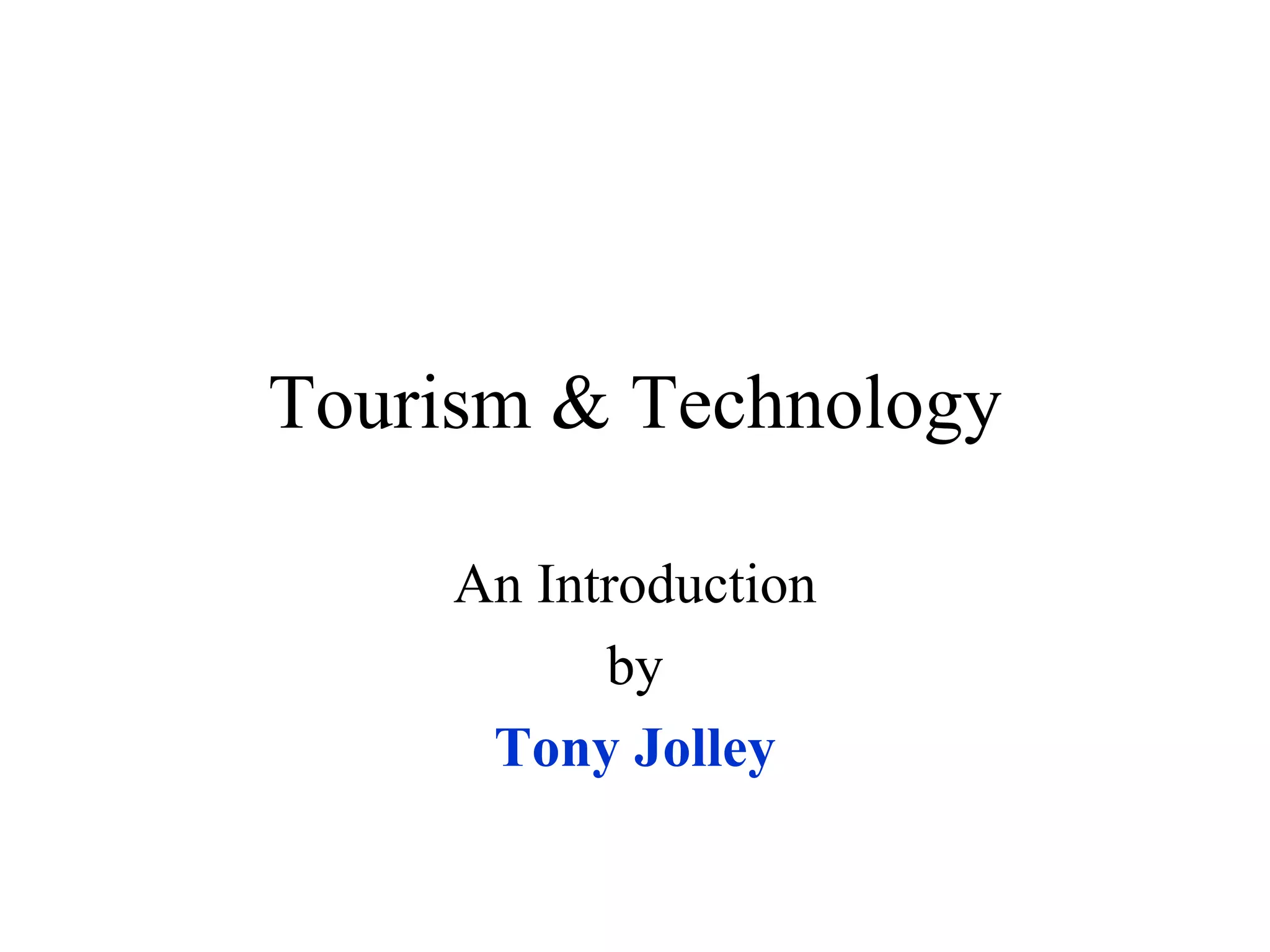 The document discusses the relationship between tourism and technology, both historically and looking towards the future. It covers how transportation technologies like ships, railways, and air travel have influenced tourism by increasing access and mobility. It also examines how information and communication technologies have disrupted tourism distribution through disintermediation, allowing direct connections between providers and consumers. The document suggests travel agents and tour operators will need to adapt by adding value or focusing on niche markets to survive as software and online booking options continue to become more advanced.