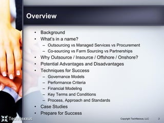 The document provides a comprehensive overview of outsourcing and strategic sourcing, highlighting definitions, advantages, disadvantages, and key success factors. It discusses when to consider outsourcing, what to outsource, and potential risks and errors to avoid, alongside strategies for financial modeling and vendor selection. The text emphasizes the importance of effective governance, communication, and preparation in achieving successful outsourcing outcomes.