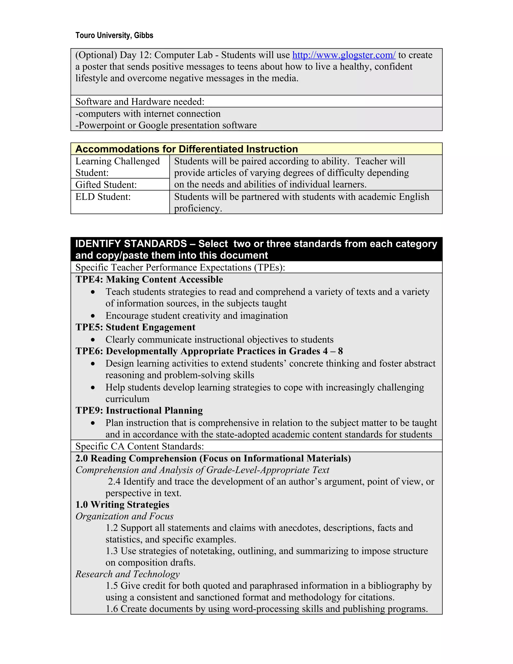 The document outlines a 12-14 day educational unit for 7th-grade students on the theme of self-image and media, focusing on media literacy and language arts. Students will engage in reading, summarizing articles, and creating PowerPoint presentations to explore how media influences self-image and feelings of self-worth. The unit includes various instructional strategies, technology integration, and accommodations to support diverse learning needs.