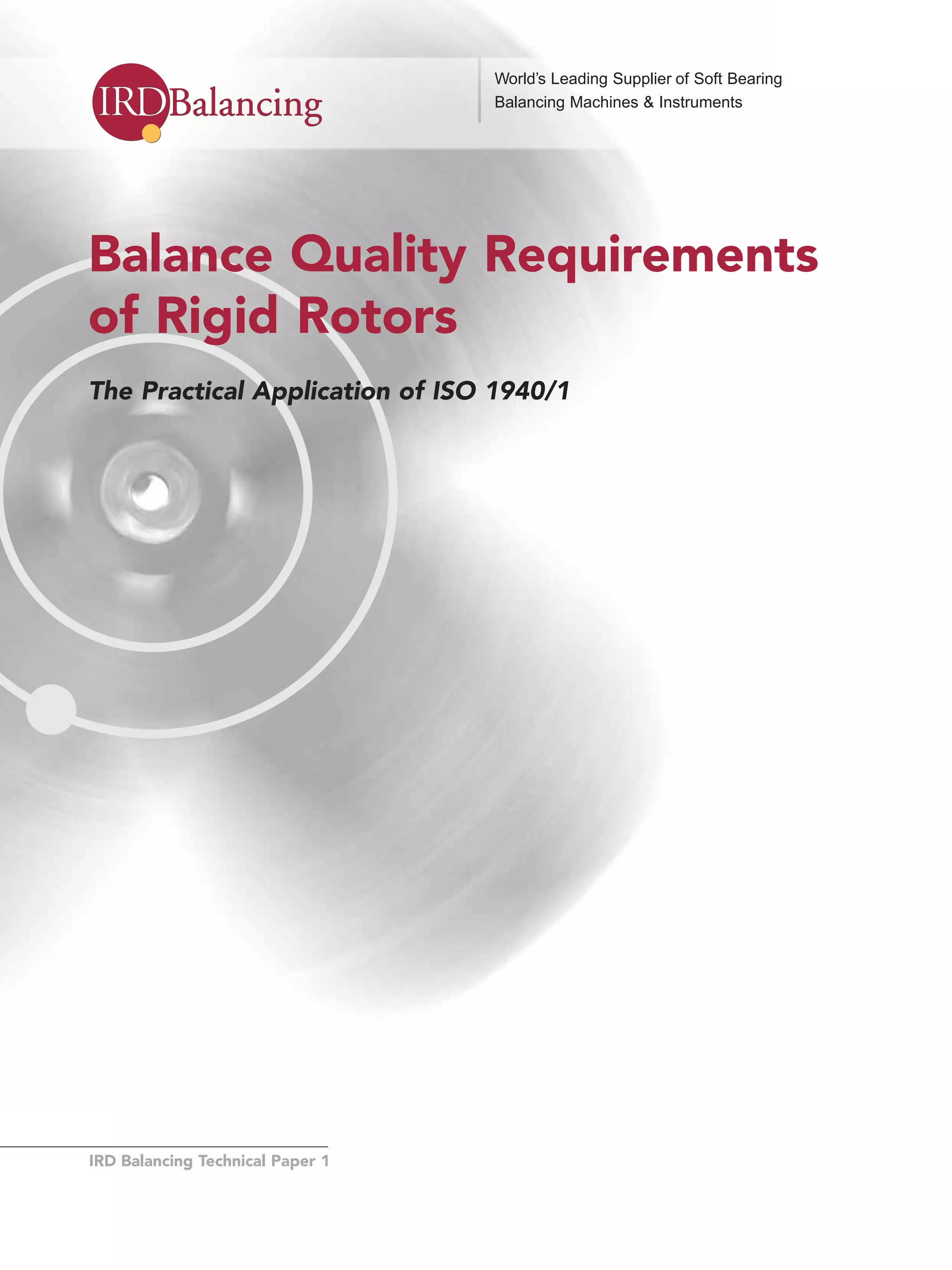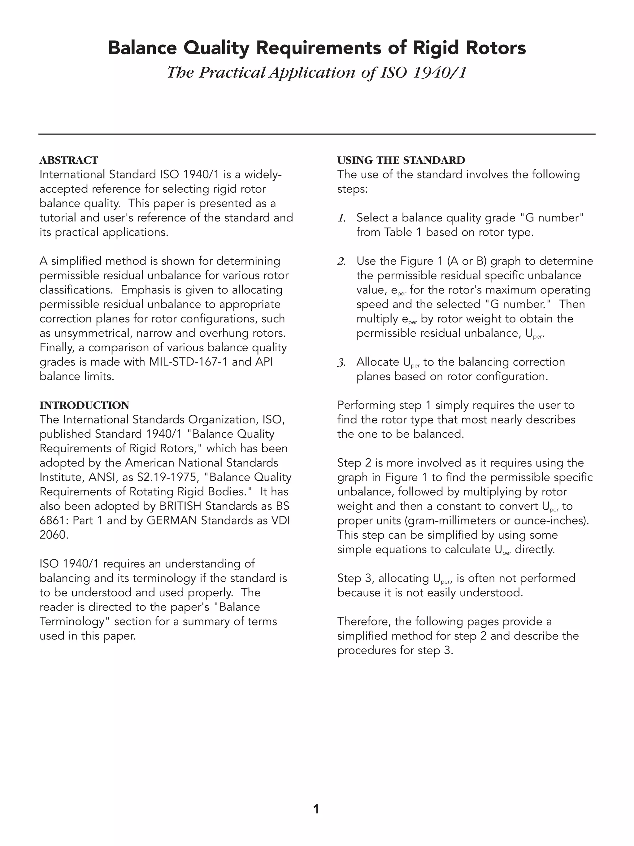 This document provides an overview and tutorial on ISO 1940/1, an international standard for selecting balance quality requirements for rigid rotors. It outlines the standard's methodology for determining permissible residual unbalance (Uper) based on rotor type, weight, and maximum operating speed. The document simplifies the calculations for Uper and provides guidance on allocating Uper between correction planes for different rotor configurations, such as symmetrical, overhung, and narrow rotors. It also compares ISO 1940/1 balance quality grades to those specified by other standards like MIL-STD-167-1 and API.