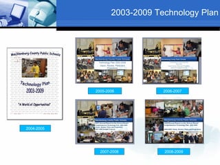 The document provides an annual report on technology initiatives for Mecklenburg County Public Schools from 2008-2009. It discusses the division's technology resource teachers, ongoing instructional initiatives like distance learning and SOL test preparation, and administrative initiatives such as online forms and a trouble ticket system. A priority goal was ensuring internet safety in schools through curriculum development and a computer crimes presentation. The division also received a grant to implement Google Applications.