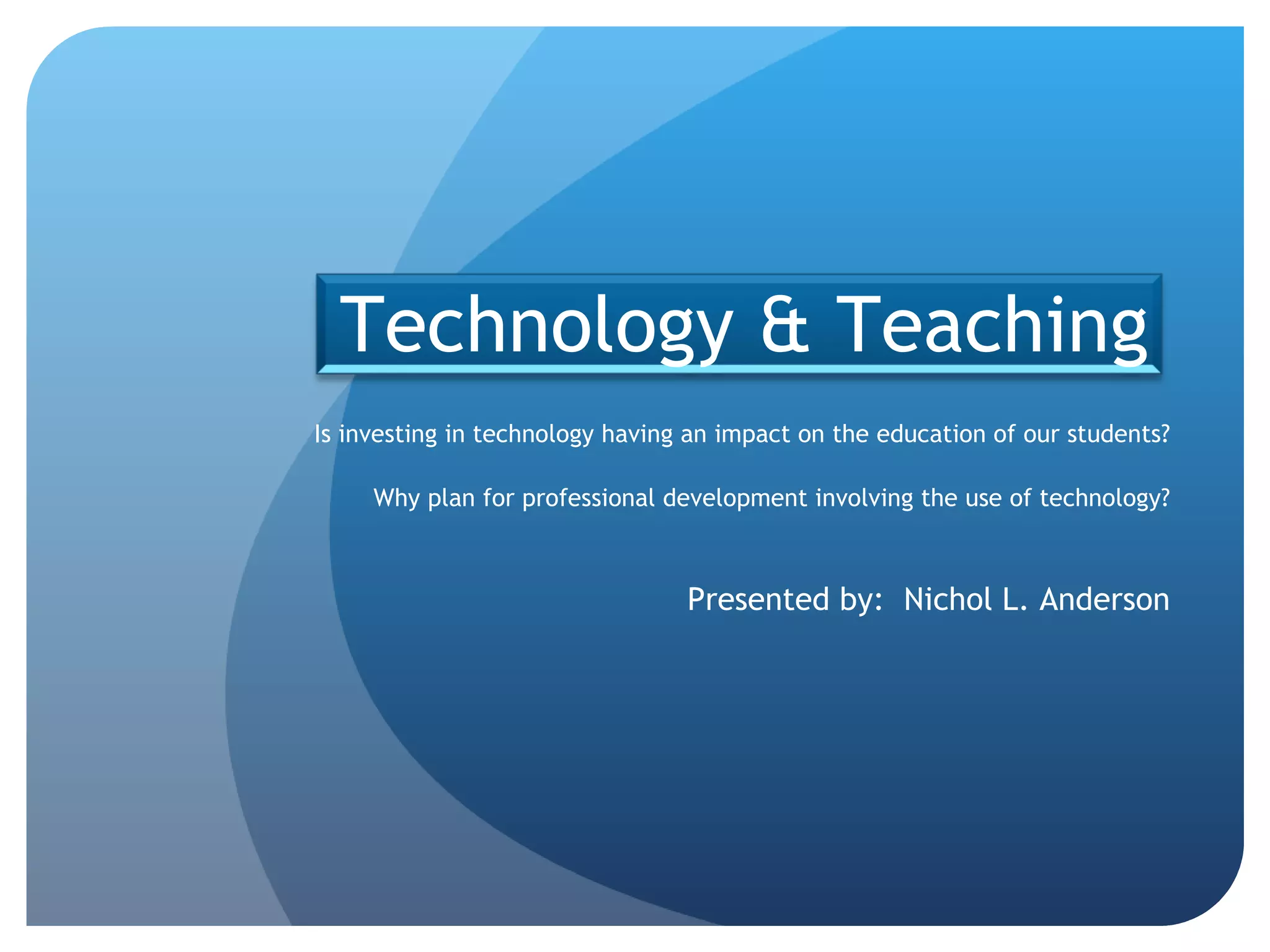 This document discusses the importance of technology in education and professional development for teachers in effectively implementing technology in the classroom. It contrasts traditional instruction with constructionist approaches using technology as a tool. Research shows technology can improve student achievement, retention, test scores, and motivation when used for collaboration, inquiry, and differentiating instruction. For teachers to fully realize technology's benefits, they require professional development to develop technological pedagogical content knowledge.
