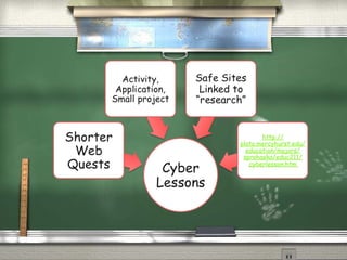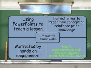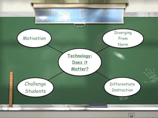 The document discusses various technologies that can be used to motivate students, including web quests, Inspiration/Kidspiration software, virtual field trips, iMovies, podcasting with Audacity and Windows Movie Maker. It provides examples and links to resources for each technology. The technologies encourage note-taking, organizing ideas, interactive lessons, supplemental videos, and alternative resources to engage students. The document advocates for using these investments at any age level to help address the "digital disconnect."