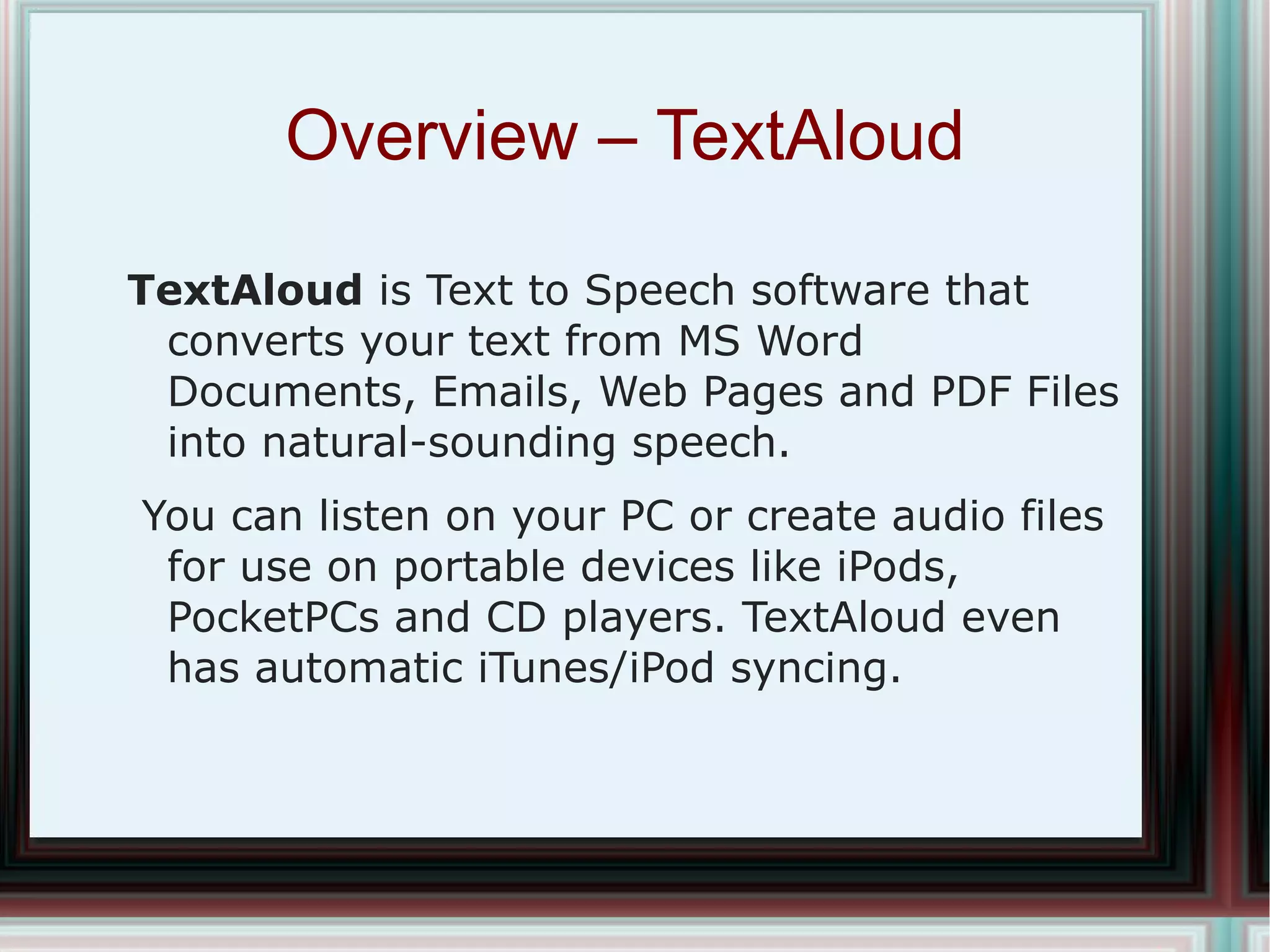 TextAloud and Speak It! are text-to-speech software programs that can be useful for students with disabilities. TextAloud converts text from Word, emails, web pages and PDFs into natural sounding speech that can be listened to or saved as audio files. Speak It! is a Mac text-to-speech app that can be used on iPad, iPhone and Mac and allows users to copy and paste text, save files, adjust speech settings. These programs provide independence for students with reading disabilities and can help with classroom work, homework, and developing technology skills needed for the future workforce.