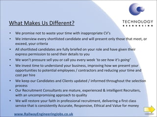 The document describes a recruitment company that specializes in recruiting railway engineering professionals. They promise an ethical recruitment process where they thoroughly interview candidates and qualify them against client roles. They have a large database of over 30,000 engineering candidates and specialize in various railway disciplines and job titles.