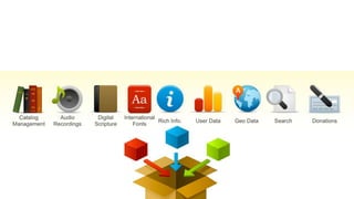 The Digital Bible Platform provides Bible content through various digital platforms and social networks. It utilizes cloud technologies, APIs, and standards compliant formats to distribute content internationally on mobile apps and online. The goal is to make the Bible widely accessible through modern digital tools.