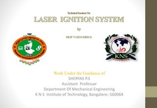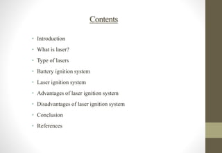 This document discusses laser ignition systems as an alternative to spark plug ignition in internal combustion engines. It begins with an introduction explaining the limitations of spark plugs and benefits of laser ignition. It then defines what a laser is and describes different types. The document outlines how laser ignition systems work, including focusing the laser beam through a lens to ignite fuel. Advantages include precise ignition timing and ability to ignite leaner mixtures. Disadvantages are currently high costs and lack of commercial systems. In conclusion, laser ignition has potential to increase efficiency but requires further development for widespread use.
