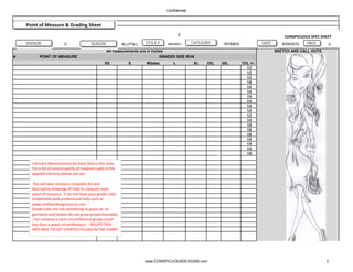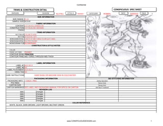The document is a detailed spec sheet for a women's clothing item (style # msd9001) dated 9/29/2010, containing fabric composition, construction details, sizing information, and care instructions. It includes a point of measure and grading sheet to assist in garment sizing and features notes on style elements and labeling. Additionally, there are references for color options and packaging information.
