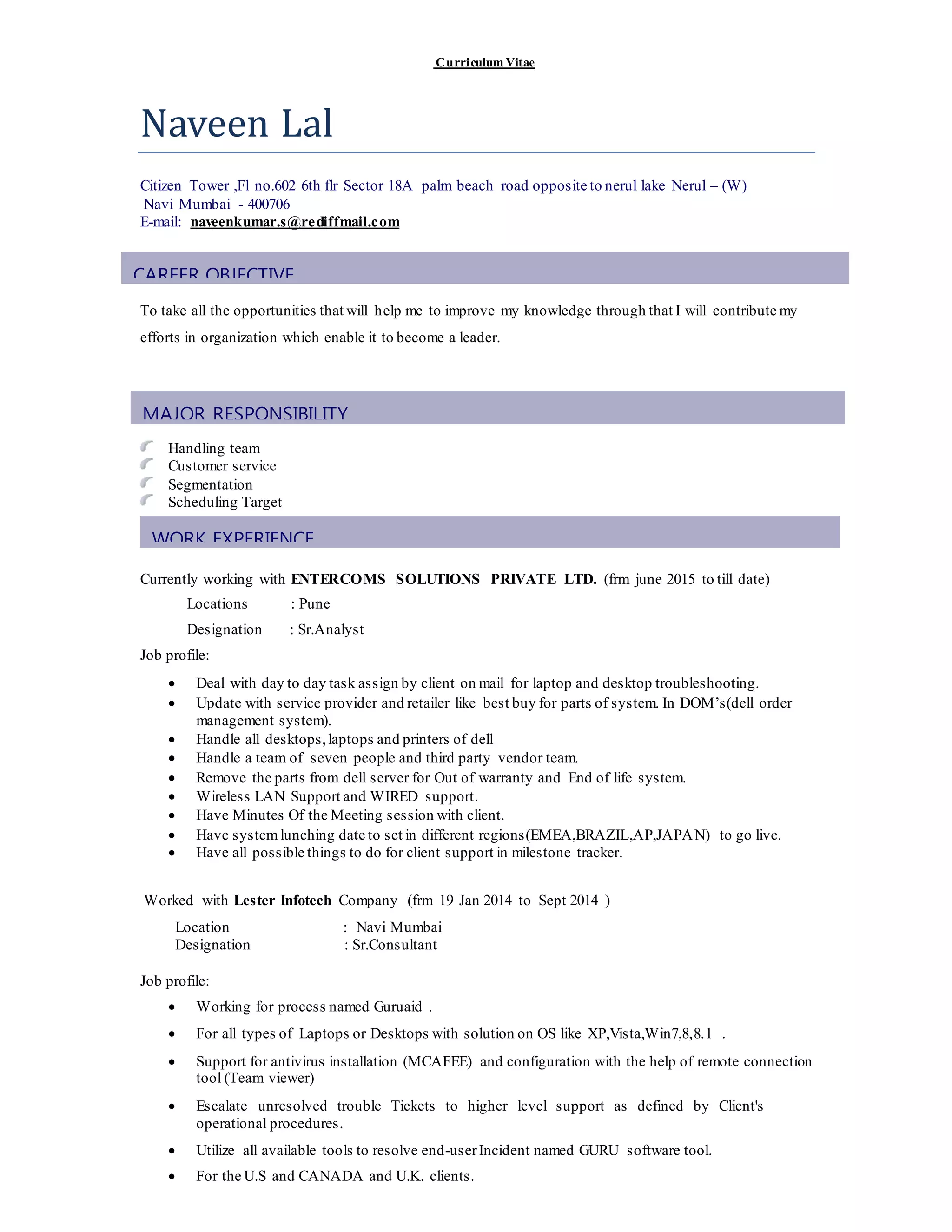 Naveen Lal has over 10 years of experience in customer service and IT support roles. He is currently a Senior Analyst at Entercoms Solutions Private Ltd in Pune, where he handles a team of seven people and provides support for desktops, laptops and printers. Previously, he worked at Lester Infotech, Sutherland Global Services, and Mphasis providing technical support and troubleshooting for hardware, software and OS issues. He has a BCS degree from North Maharashtra University and technical skills in Windows, Office, networking and remote desktop support tools.