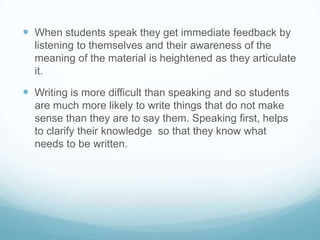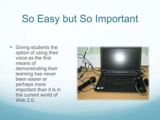 Giving students the option to use their voice as the primary means to demonstrate their learning has educational benefits. Speaking allows for immediate feedback and clarification of ideas, which helps students better understand concepts and articulate their thinking. As technologies advance, the ability to clearly communicate ideas through speaking will become increasingly important. Research indicates that students develop knowledge and thinking through speaking before writing. For young primary students especially, encouraging oral expression over written work can better reveal their understanding.