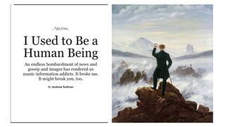 This document discusses strategies for promoting productivity and creativity while reducing distraction from digital devices. It begins by outlining some of the negative impacts of excessive smartphone and social media use, such as only spending 2% of time creating and feeling constantly distracted. It then provides several solutions, including tracking app and screen time usage, creating boundaries by turning off notifications and scheduling email checks, focusing on one task at a time using the Pomodoro technique, reducing consumption by deleting unneeded apps or social media accounts, and collaborating with others on creative projects. The overall message is that digital technologies should serve our goals of learning, creating and problem-solving rather than distracting or limiting us.