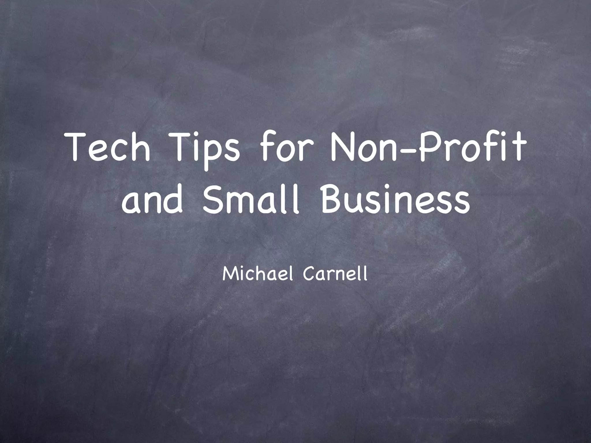 This document provides tips for using technology effectively as a non-profit or small business. It covers maintaining hardware through proper care, backups, and security updates. It also recommends standardizing software, using free and open source options when possible, and cloud-based collaboration tools. Social media guidance includes claiming organization profiles and using alert services. Maintaining staff through training and ergonomics is also covered, along with resources for reduced cost technology solutions.