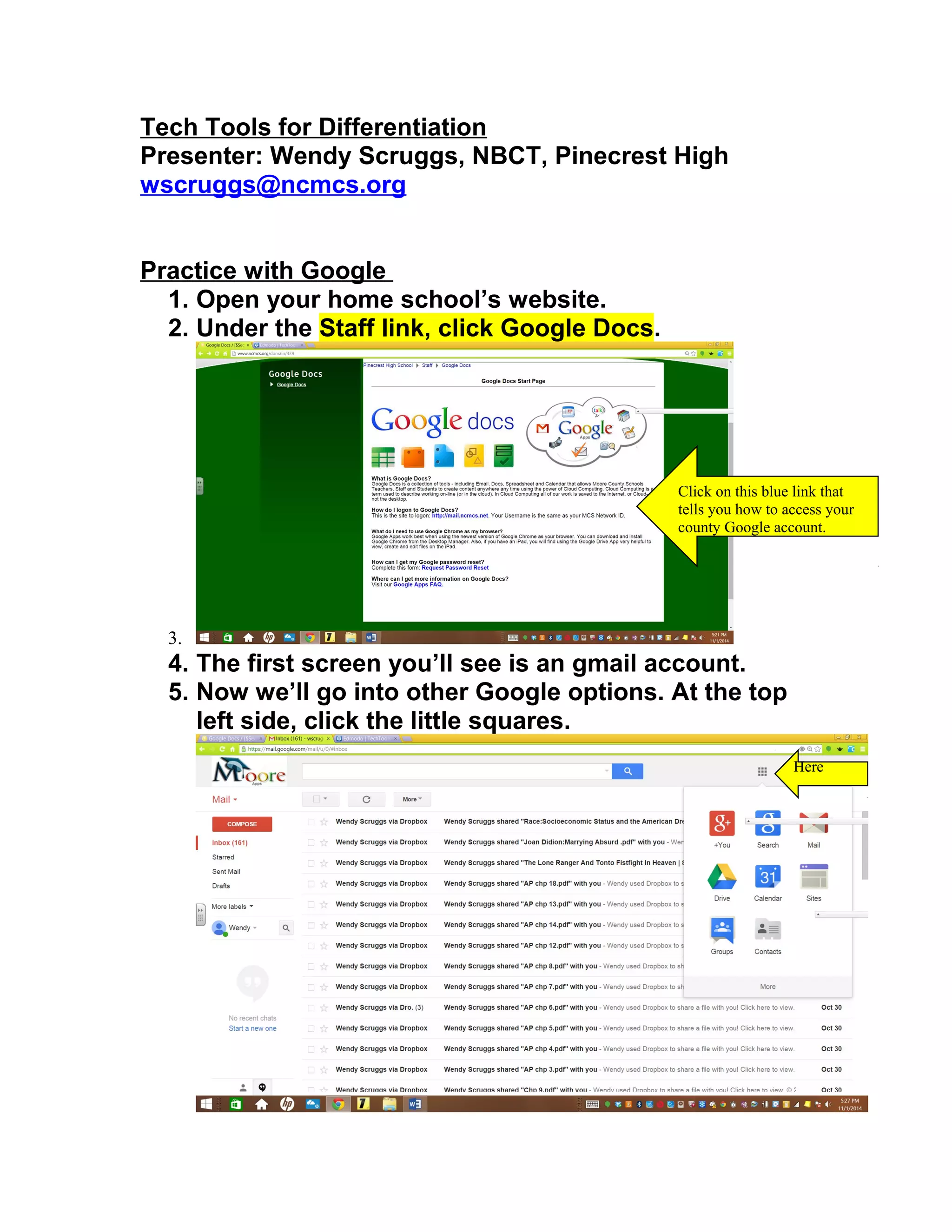 The document discusses various free tech tools that can be used for differentiation, including Google Docs, Sites, Slideshare, Padlet, Livebinders, Animoto, Glogster, Toondoo, and Wordles. It provides instructions for setting up and using Google accounts and sites for collaboration between teachers and students. Examples are given of how tools like Google Docs can be used for peer editing, discussion sites, homework, and interactive study guides. The goal is to showcase free resources that teachers can employ in their classrooms.