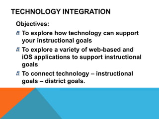 This document provides an overview of various technology tools and applications that can be used to support instructional goals in different subject areas. It discusses how tools like Socrative, Infuse Learning, Padlet, and LearnZillion can be used to increase skills in areas like math, reading, geography, and 21st century skills. It also explores how technology can be used to increase student engagement, meet the needs of diverse learners, and increase productivity by reducing paper use. The document shares several cloud storage, file sharing, and digital creation tools as well. It aims to connect the use of technology to specific instructional goals and district goals.