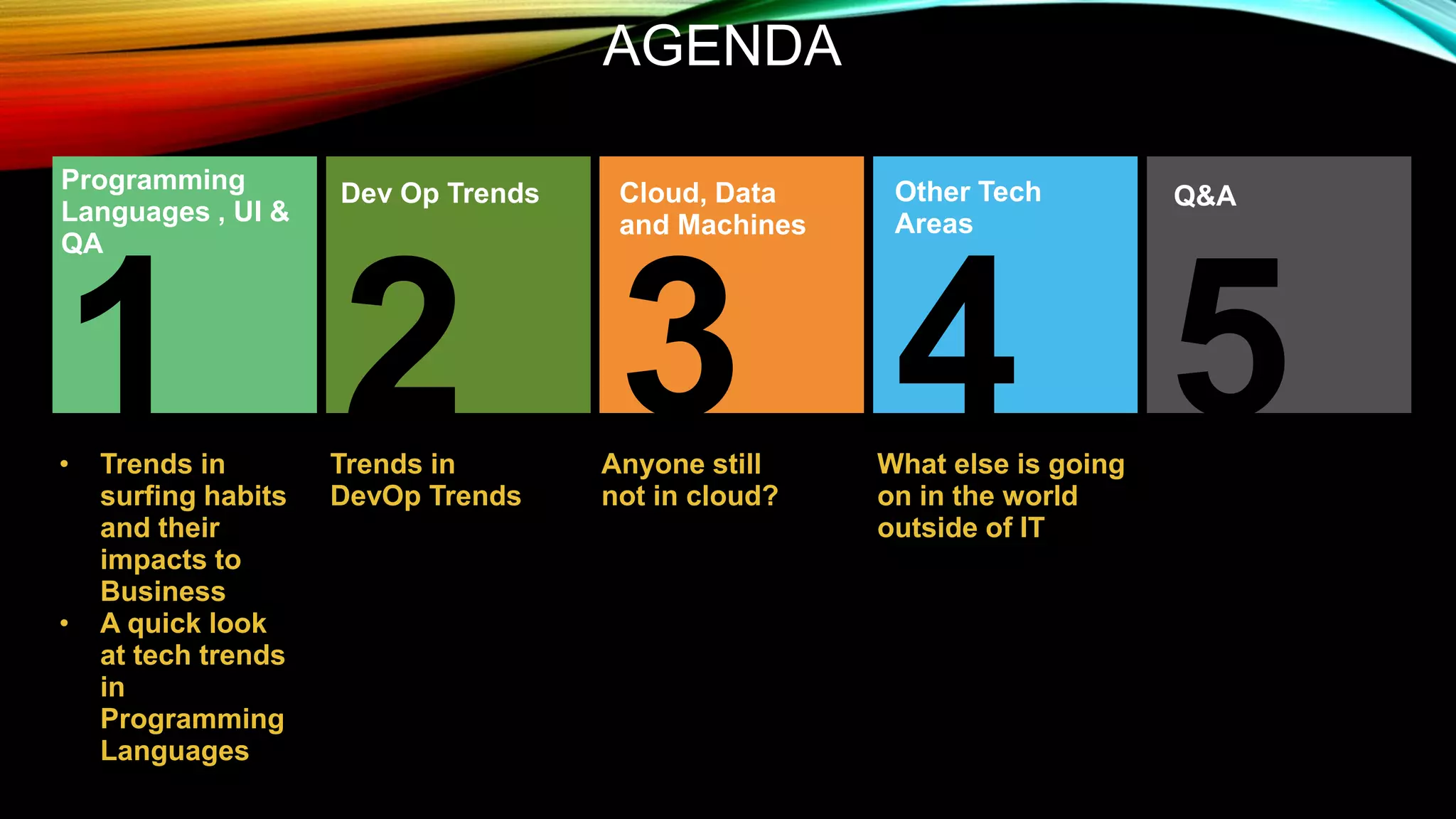 The document presents a comprehensive overview of current tech trends across various domains, including programming languages, UI/QA, DevOps, cloud computing, e-commerce, AI, and big data. Key highlights include the rise of mobile usage, the impact of cloud solutions on hardware costs, and significant advancements in programming languages like Java, Python, and Go. Additionally, it discusses the growth of e-commerce platforms, the importance of automation in QA/QC, and the emerging trends in AI and robotics.