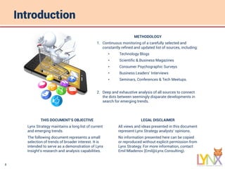 The document explores the impact of technology trends and social developments on consumer behavior, highlighting key trends such as the 'quantified self,' mindfulness, the physical-digital merger, and piecemeal consumption. It emphasizes the increasing integration of digital tools into daily life and consumer routines, while also raising concerns about technology addiction and the need for mindful interactions. The insights presented are based on a combination of continuous monitoring and deep analysis of various sources, providing a snapshot of emerging consumer behaviors.