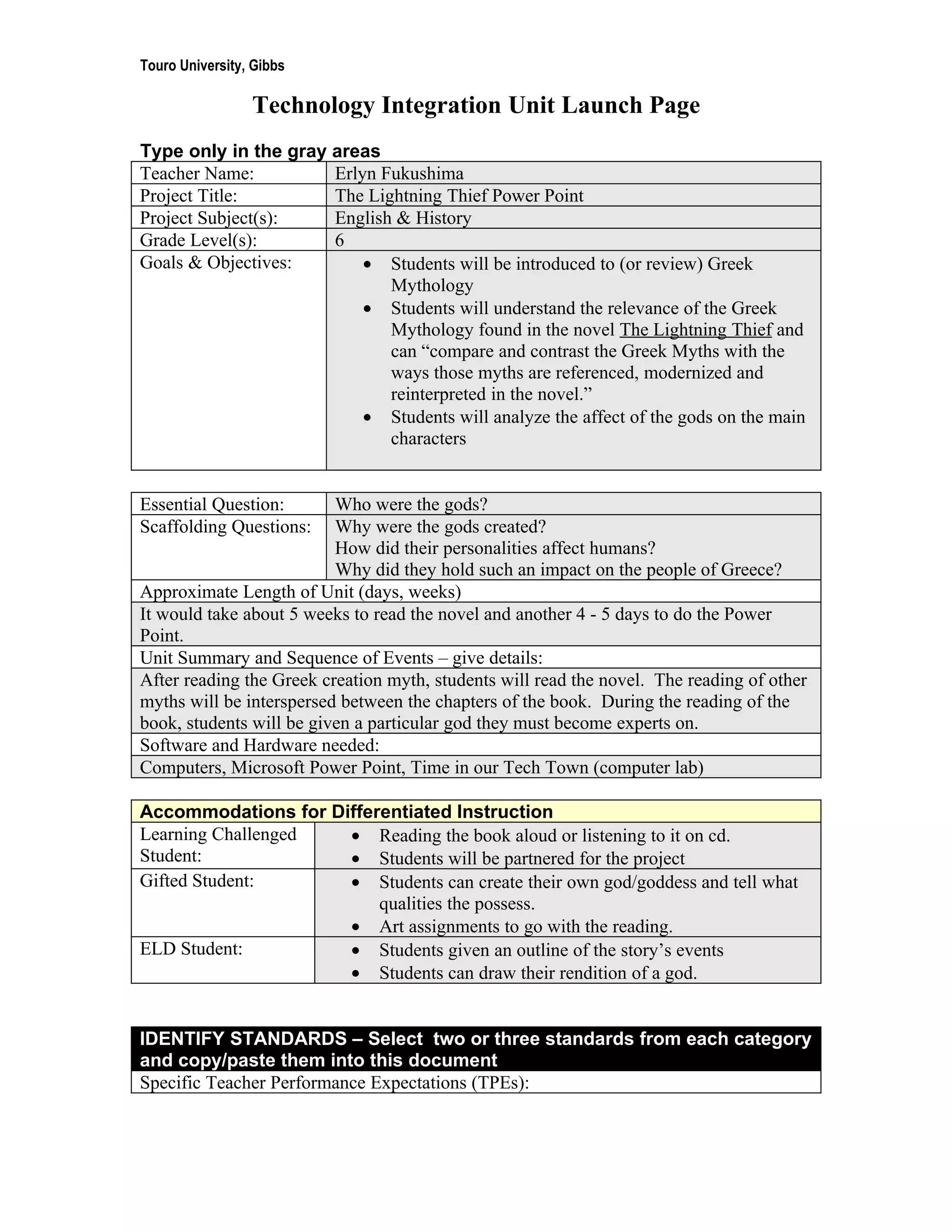 The teacher, Erlyn Fukushima, is creating a 5 week unit on the novel "The Lightning Thief" that incorporates Greek mythology. Students will read the novel and myths, learn about different gods, and create a PowerPoint presentation on a god of their choice. The unit goals are for students to understand Greek mythology in the novel and how the gods impact characters. It will require computers, PowerPoint, and the computer lab. Accommodations include assisting struggling readers and providing additional challenges for gifted students. Standards addressed include English language arts standards on literary analysis and writing, as well as ISTE technology standards.