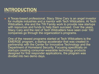 Tech Wildcatters' Emerge program, founded by Stacy Cary, is a startup accelerator focused on consumer-wearable technology for first responders, in partnership with the Center for Innovative Technology and the Department of Homeland Security. The program includes a 12-week mentor-driven course and features demo days in Dallas and San Francisco. Four startups have completed the program since its 2015 launch, developing products that enhance first responder communications and operational efficiency.