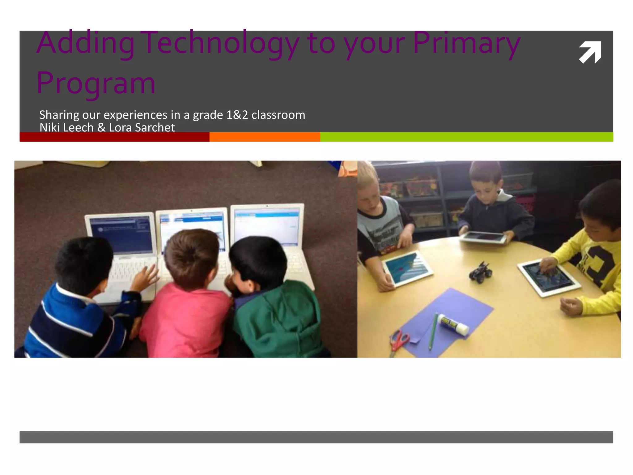 The document discusses adding technology to a primary grade 1-2 classroom. It aims to use 21st century skills, teach digital responsibility, connect the classroom to the world, and increase student engagement. Suggested technologies include using a classroom blog for parents, Skype for author visits and global storytime, Twitter to build a professional learning network, and creation apps like Book Creator and iMovie for student projects. Student examples are provided and web tools like Wordle and Dropbox are mentioned to provide choice in learning.